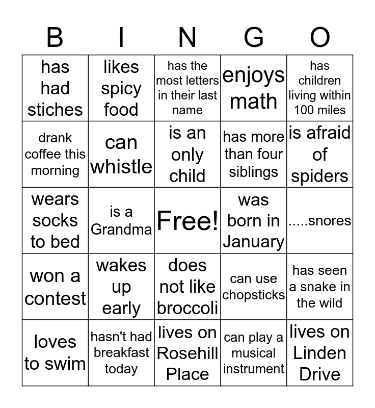 This bingo card has a free space and 24 words: wakes up early, hasn't had breakfast today, is an only child, loves to swim, has children living within 100 miles, has had stiches, drank coffee this morning, likes spicy food, was born in January, does not like broccoli, has more than four siblings, wears socks to bed, can use chopsticks, has seen a snake in the wild, can whistle, can play a musical instrument, .....snores, has the most letters in their last name, is afraid of spiders, is a Grandma, lives on Linden Drive, won a contest, enjoys math and lives on Rosehill Place.