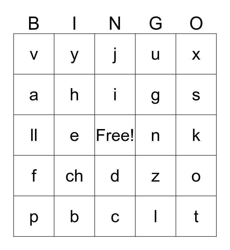 This bingo card has a free space and 24 words: ch, b, i, p, x, v, a, y, n, d, g, ll, z, o, h, l, k, j, s, e, t, f, u and c.