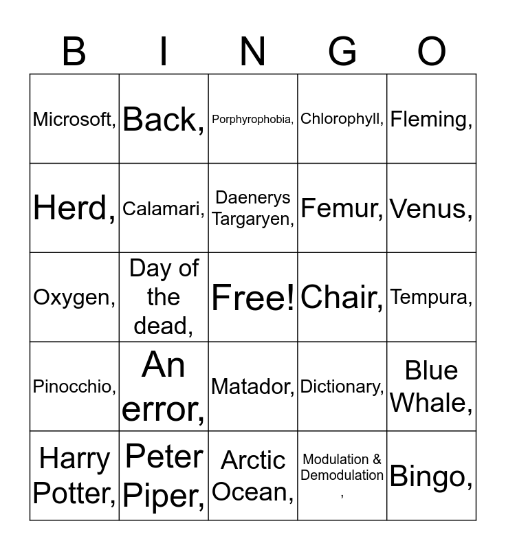 This bingo card has a free space and 75 words: Central Processing Unit,, Jay Englis,, Porphyrophobia,, The Sun,, Theon Greyjoy,, Lara Croft,, Hebe,, Bacolod,, 10,, Rachel,, Coal Mountain Resort,, Miss D.,, Daenerys Targaryen,, Herd,, Six,, Day of the dead,, Jover,, Bingo,, Michael Jackson,, Fleming,, Blue moon,, Oxygen,, Calamari,, Back,, Chlorophyll,, Cygnet,, Botany,, CSS,, The goat,, Pluto,, Gale Puerto,, Hair,, Taylor Swift,, Dictionary,, Venus,, Femur,, Bishop,, MAYONNAISE,, Tempura,, Modulation & Demodulation ,, Butterfly,, Philippine peso,, Gold,, Viserion,, Shookt,, And,, Harry Potter,, Microsoft,, 7107,, 500,, Sony,, Matador,, Meteors,, Batman,, Simba,, Diameter,, Eros,, Siesta,, Plumber,, Barbie,, An error,, Milky Way,, October,, Knee,, Humanity,, Chair,, Christmas card,, The Beatles,, Kuwait City,, Blue Whale,, Pinocchio,, Peter Piper,, St. Nicholas,, Arctic Ocean, and Dec-31.