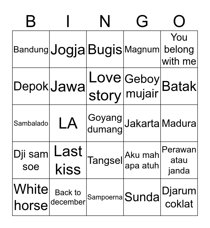 This bingo card has a free space and 24 words: Last kiss, Back to december, Love story, White horse, You belong with me, Bandung, Depok, Jogja, Jakarta, Tangsel, Geboy mujair, Sambalado, Aku mah apa atuh, Perawan atau janda, Jawa, Sunda, Madura, Bugis, Batak, LA, Djarum coklat, Dji sam soe, Magnum and Sampoerna.
