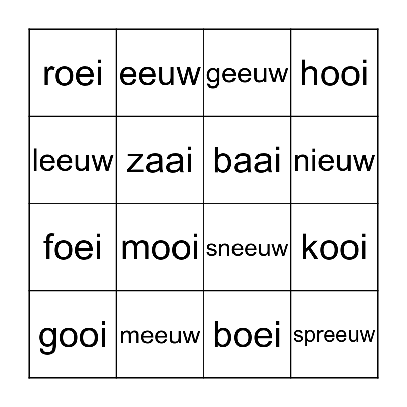 This bingo card has 16 words: meeuw, kooi, geeuw, roei, foei, eeuw, sneeuw, boei, leeuw, zaai, gooi, hooi, mooi, nieuw, baai and spreeuw.