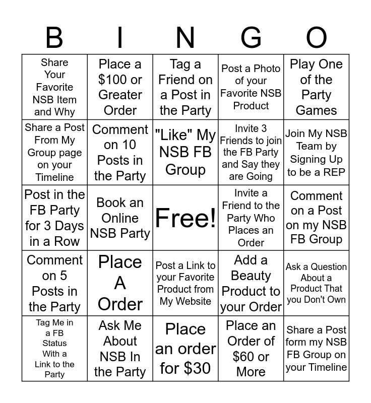 This bingo card has a free space and 24 words: Place A Order, Ask Me About NSB In the Party, "Like" My NSB FB Group, Tag Me in a FB Status With a Link to the Party, Play One of the Party Games, Share Your Favorite NSB Item and Why, Share a Post From My Group page on your Timeline, Place a $100 or Greater Order, Invite a Friend to the Party Who Places an Order, Post a Link to your Favorite Product from My Website, Invite 3 Friends to join the FB Party and Say they are Going, Post in the FB Party for 3 Days in a Row, Add a Beauty Product to your Order, Ask a Question About a Product That you Don't Own, Comment on 10 Posts in the Party, Place an Order of $60 or More, Comment on a Post on my NSB FB Group, Tag a Friend on a Post in the Party, Join My NSB Team by Signing Up to be a REP, Book an Online NSB Party, Share a Post form my NSB FB Group on your Timeline, Comment on 5 Posts in the Party, Post a Photo of your Favorite NSB Product and Place an order for $30.