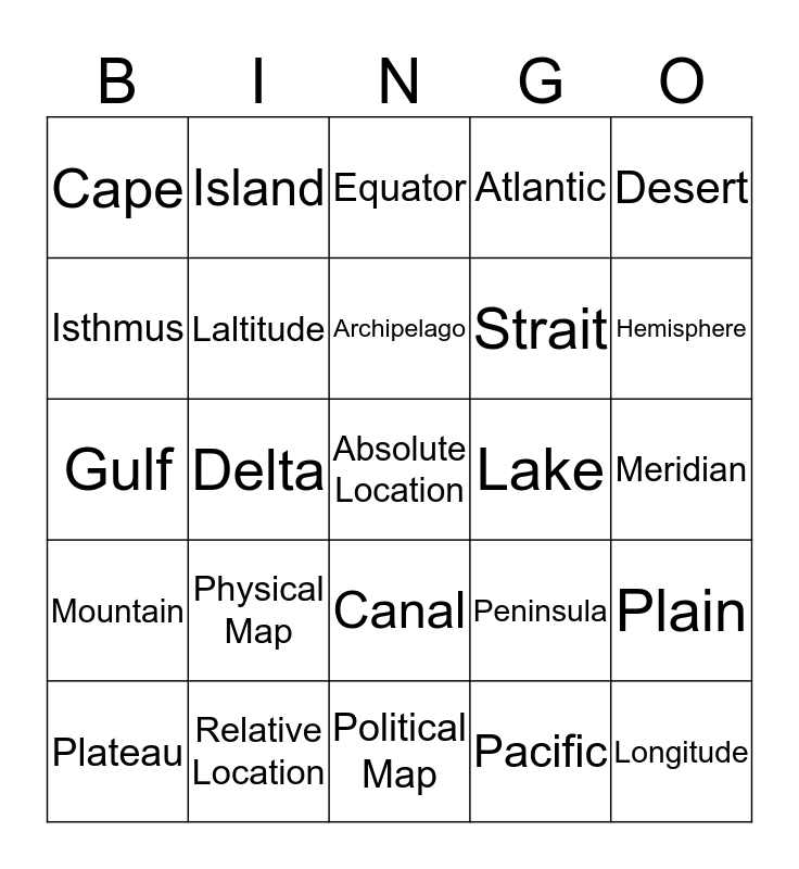 This bingo card has 25 words: Physical Map, Political Map, Archipelago, Plateau, Desert, Cape, Isthmus, Island, Lake, Canal, Strait, Gulf, Peninsula, Plain, Laltitude, Longitude, Meridian, Equator, Hemisphere, Delta, Absolute Location, Relative Location, Mountain, Atlantic and Pacific.