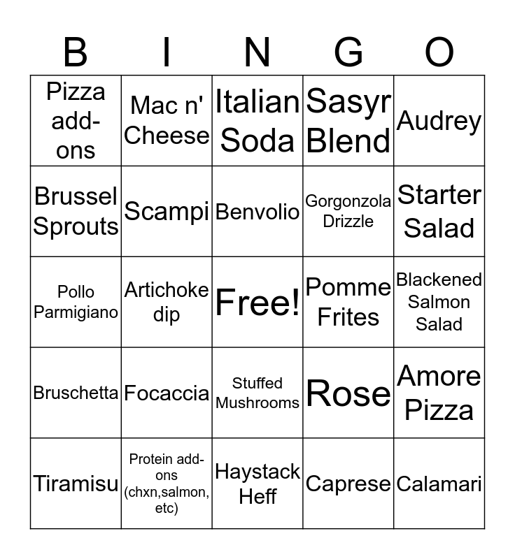 This bingo card has a free space and 24 words: Focaccia, Protein add-ons (chxn,salmon, etc), Benvolio, Tiramisu, Audrey, Pizza add-ons, Brussel Sprouts, Mac n' Cheese, Pomme Frites, Stuffed Mushrooms, Gorgonzola Drizzle, Pollo Parmigiano, Rose, Amore Pizza, Scampi, Caprese, Blackened Salmon Salad, Italian Soda, Starter Salad, Artichoke dip, Calamari, Bruschetta, Sasyr Blend and Haystack Heff.