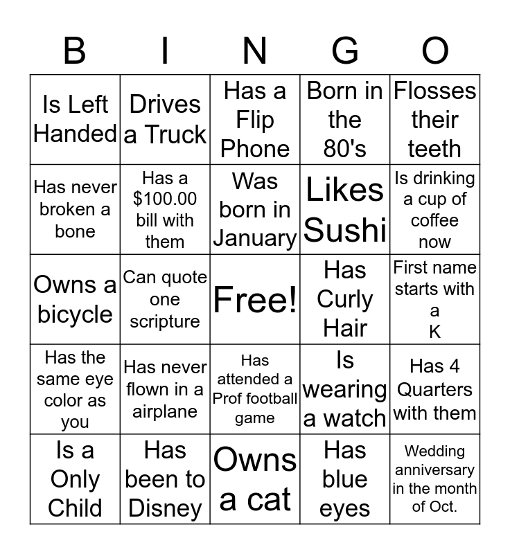 This bingo card has a free space and 24 words: Has never flown in a airplane, Has been to Disney, Was born in January, Is a Only Child, Flosses their teeth, Is Left Handed, Has never broken a bone, Drives a Truck, Has Curly Hair, Has attended a Prof football game, Likes Sushi, Owns a bicycle, Is wearing a watch, Has 4 Quarters with them, Has a $100.00 bill with them, Has blue eyes, First name starts with a K, Has a Flip Phone, Is drinking a cup of coffee now, Can quote one scripture, Wedding anniversary in the month of Oct., Has the same eye color as you, Born in the 80's and Owns a cat.