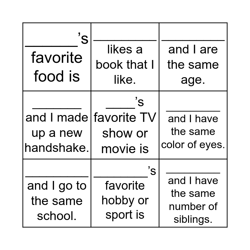 This bingo card has a free space and 8 words: _________ and I have the same color of eyes., _________ and I are the same age., _________ likes a book that I like., _________ and I go to the same school., ______’s favorite food is, _________ and I have the same number of siblings., _______ and I made up a new handshake. and ________’s favorite hobby or sport is.