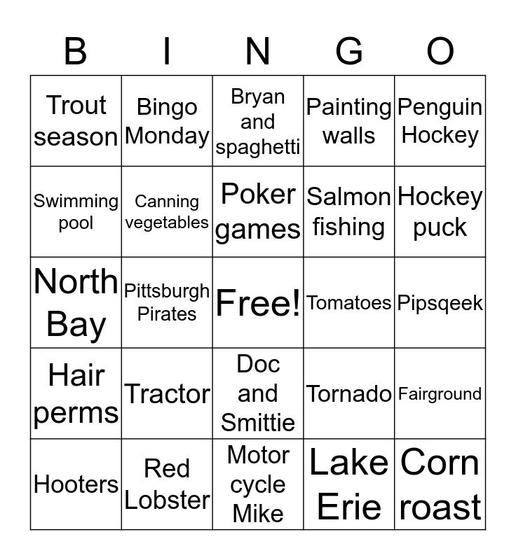 This bingo card has a free space and 51 words: Nikko, Corn roast, Daisey Mae, Motor cycle Mike, Tractor, Atlantic City, Bingo Monday, Horseshoe court, Swimming pool, Motorhome, Canning vegetables, Painting walls, Fairground, Tornado, Hawaii, Winning a Chrysler, Poker games, Tomatoes, Steeler football, Penguin Hockey, Pittsburgh Pirates, Lake Erie, Trout season, Salmon fishing, Wallet eaten by the carp, QVC, Hockey puck, Loosing teeth at Pirate game, Hooters, Bryan and spaghetti, Brad's upside down retainer, Tim and football, Chippewa Bakery, Bell Telephone operator, Jewelry, Red Lobster, Color purple, Christmas gatherings, Pizzelle cookies, Weekend puzzles, Pipsqeek, Hair perms, Canada, Klem's camp, Bob's Cabin, Muskie fishing, North Bay, Deer hunting, Peyton Place, Doc and Smittie and Disneyland and Disney world.