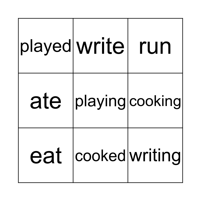 This bingo card has a free space and 17 words: ran, running, run, played, play, ate, eating, eat, cooked, cooking, cook, wrote, writing, write, jumped, jumping and jumped.