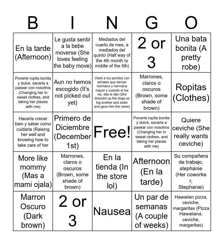 This bingo card has a free space and 29 words: Marron Oscuro (Dark brown), 7 Libras (Pounds), Primero de Diciembre (December 1st), 20 pulgadas (inches), En la tarde (Afternoon), Mediados del cuarto de mes, a mediados del quinto (Half way of the 4th month to middle of the 5th), Aun no hemos escogido (It’s not picked out yet), Marrones, claros o oscuros (Brown, some shade of brown), Ponerle ropita bonita y dulce, sacarla a pasear con nosotros (Changing her in sweet clothes, and taking her places with me), 2 or 3, Quiere ceviche (She really wants ceviche), Hawaiian pizza, ceviche, margaritas (Pizza Hawaiiana, ceviche, margaritas), Nausea, Un par de semanas (A couple of weeks), Ropitas (Clothes), Si, pero no mucho (Yes, but not too much), En la tienda (In the store lol), More like mommy (Mas a mami ojala), Una bata bonita (A pretty robe), Hacerla crecer bien y saber como cuidarla (Raising her well and knowing how to take care of her, Afternoon (En la tarde), Mediados del cuarto mes, a mediados del quinto (Half way of the 4th month to middle of the 5th), Marrones, claros o oscuros (Brown, some shade of brown), Ponerle ropita bonita y dulce, sacarla a pasear con nosotros (Changing her in sweet clothes, and taking her places with me), 2 or 3, Le gusta sentir a la bebe moverse (She loves feeling the baby move), Su compañera de trabajo, stephanie (Her coworker, Stephanie), Vistió a los perritos con señales que decían hermano y hermana mayor y cuando el los vio, ella le dijo (She dressed up the dogs as big brother and sister and gave him the news) and Si, si (Yes, yes).