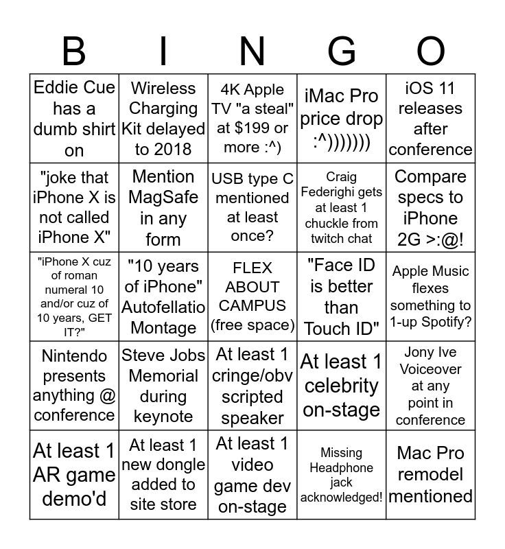 This bingo card has a free space and 24 words: Steve Jobs Memorial during keynote, At least 1 new dongle added to site store, USB type C mentioned at least once?, At least 1 AR game demo'd, iOS 11 releases after conference, Eddie Cue has a dumb shirt on, "joke that iPhone X is not called iPhone X", Wireless Charging Kit delayed to 2018, "Face ID is better than Touch ID", At least 1 cringe/obv scripted speaker, Craig Federighi gets at least 1 chuckle from twitch chat, "iPhone X cuz of roman numeral 10 and/or cuz of 10 years, GET IT?", At least 1 celebrity on-stage, Jony Ive Voiceover at any point in conference, Mention MagSafe in any form, Missing Headphone jack acknowledged!, Apple Music flexes something to 1-up Spotify?, 4K Apple TV "a steal" at $199 or more :^), Compare specs to iPhone 2G >:@!, "10 years of iPhone" Autofellatio Montage, Mac Pro remodel mentioned, Nintendo presents anything @ conference, iMac Pro price drop :^))))))) and At least 1 video game dev on-stage.
