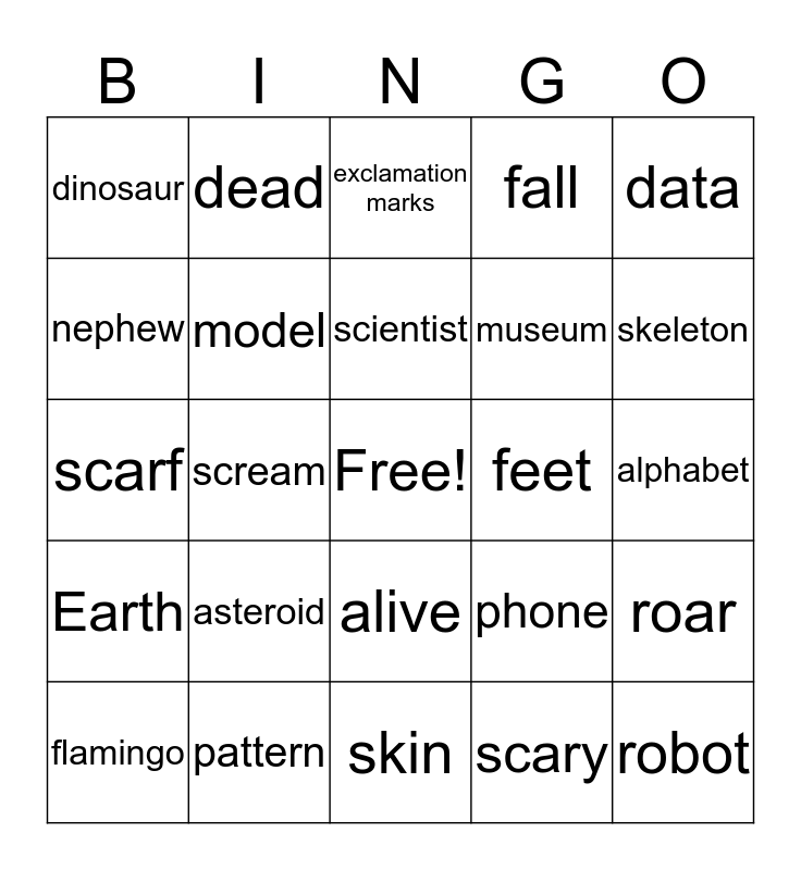 This bingo card has a free space and 24 words: asteroid, pattern, scientist, flamingo, data, dinosaur, nephew, dead, feet, alive, museum, scarf, phone, roar, model, scary, alphabet, exclamation marks, skeleton, scream, robot, Earth, fall and skin.