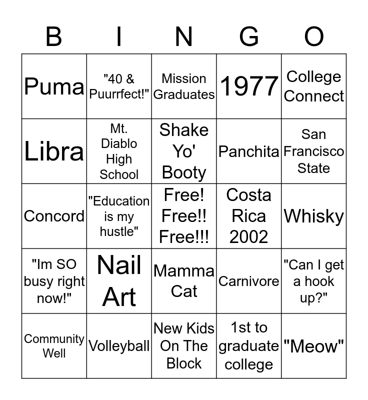 This bingo card has a free space and 24 words: Nail Art, Volleyball, Shake Yo' Booty, Community Well, College Connect, Puma, Libra, "40 & Puurrfect!", Costa Rica 2002, Mamma Cat, Panchita, Concord, Carnivore, "Can I get a hook up?", Mt. Diablo High School, 1st to graduate college, Whisky, Mission Graduates, San Francisco State, "Education is my hustle", "Meow", "Im SO busy right now!", 1977 and New Kids On The Block.