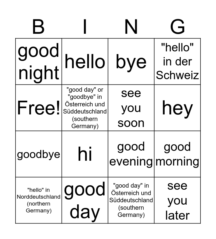 This bingo card has 16 words: good day, good morning, bye, good night, goodbye, hello, good evening, "good day" in Österreich und Süddeutschland (southern Germany), Free!, "good day" or "goodbye" in Österreich und Süddeutschland (southern Germany), "hello" in Norddeutschland (northern Germany), "hello" in der Schweiz, hi, hey, see you soon and see you later.