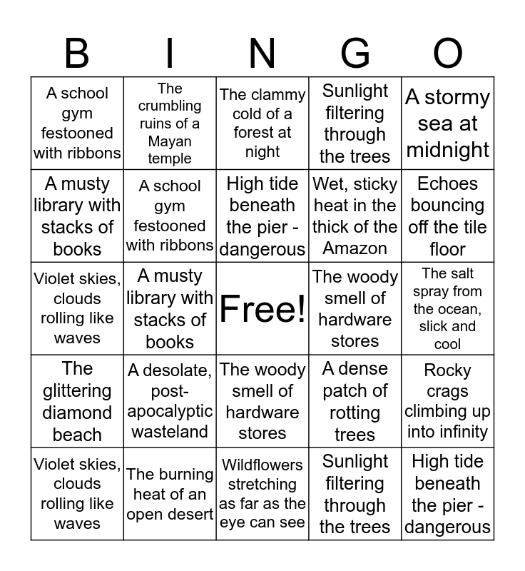 This bingo card has a free space and 35 words: A stormy sea at midnight, The basement of a celebrity's mansion, The back of a pickup going 60mph, A school gym festooned with ribbons, The woody smell of hardware stores, Sunlight filtering through the trees, A musty library with stacks of books, The glittering diamond beach, High tide beneath the pier - dangerous, A dense patch of rotting trees, Violet skies, clouds rolling like waves, A stormy sea at midnight, The basement of a celebrity's mansion, The back of a pickup going 60mph, A school gym festooned with ribbons, The woody smell of hardware stores, Sunlight filtering through the trees, A musty library with stacks of books, The glittering diamond beach, High tide beneath the pier - dangerous, A dense patch of rotting trees, Violet skies, clouds rolling like waves, Rocky crags climbing up into infinity, The burning heat of an open desert, The clammy cold of a forest at night, Echoes bouncing off the tile floor, Candles flickering from the massive chandeliers, The sterile smell of a hospital, Wet, sticky heat in the thick of the Amazon, The salt spray from the ocean, slick and cool, The campfire smoke trailing towards the stars, Wildflowers stretching as far as the eye can see, A desolate, post-apocalyptic wasteland, The crumbling ruins of a Mayan temple and The cold, dirty passageways of a tomb.