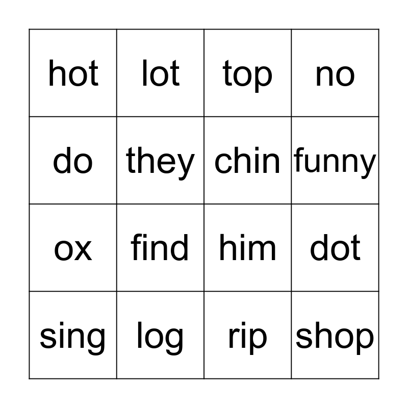 This bingo card has 16 words: log, dot, top, hot, ox, lot, him, rip, do, they, sing, no, find, funny, chin and shop.