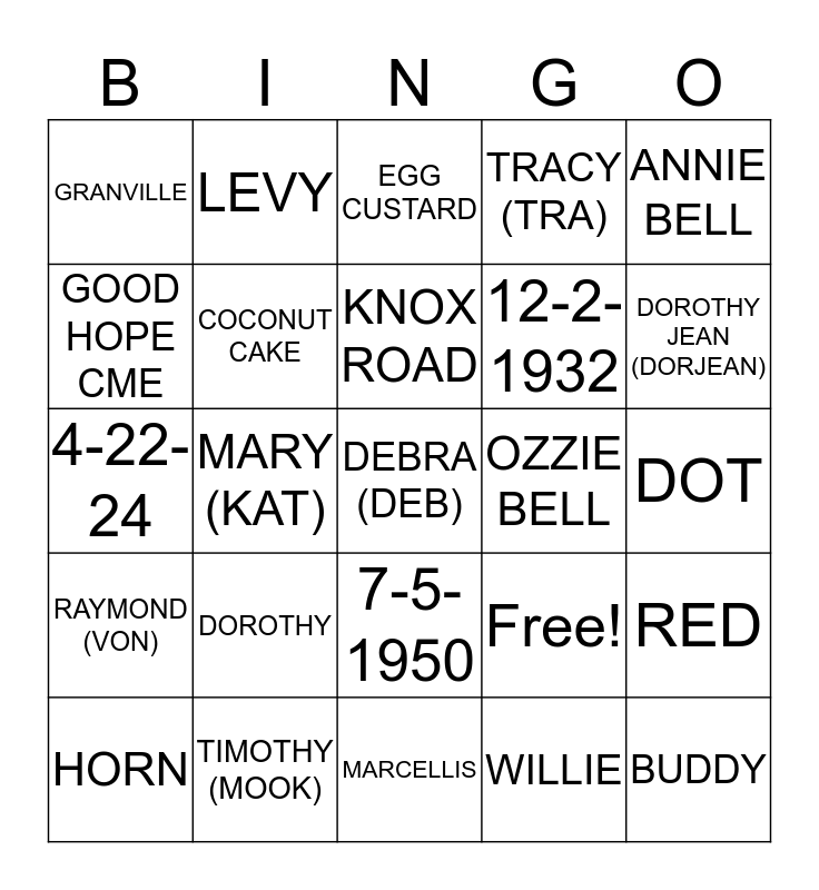 This bingo card has 25 words: DOROTHY, MARCELLIS, KNOX ROAD, HORN, ANNIE BELL, GRANVILLE, GOOD HOPE CME, LEVY, OZZIE BELL, 7-5-1950, 12-2-1932, 4-22-24, Free!, RED, COCONUT CAKE, BUDDY, DOT, EGG CUSTARD, DOROTHY JEAN (DORJEAN), MARY (KAT), DEBRA (DEB), TIMOTHY (MOOK), RAYMOND (VON), TRACY (TRA) and WILLIE.