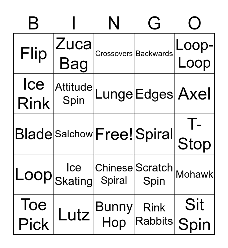 This bingo card has a free space and 30 words: Lutz, Waltz Jump, Salchow, Reverse Spin, Flip, Crossovers, Attitude Spin, Chinese Spiral, Spiral, Bunny Hop, T-Stop, Sit Spin, Rink Rabbits, Camel Spin, Axel, Toe Loop, Scratch Spin, Loop, Ice Skating, Loop-Loop, Blade, Gloves, Zuca Bag, Edges, Ice Rink, Backwards, Mohawk, Toe Pick, Lunge and Shoot the Duck.