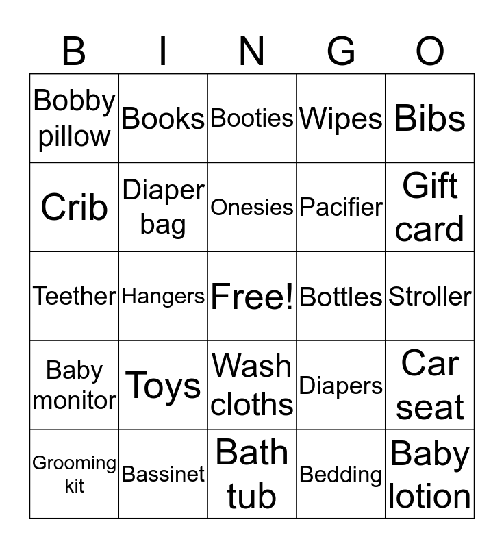 This bingo card has a free space and 25 words: Baby monitor, Bassinet, Bath tub, Bedding, Bibs, Bobby pillow, Books, Booties, Bottles, Car seat, Crib, Diaper bag, Diaper genie, Diapers, Gift card, Grooming kit, Hangers, Onesies, Pacifier, Stroller, Teether, Toys, Wash cloths, Wipes and Baby lotion.