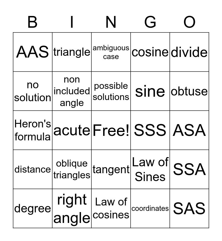 This bingo card has a free space and 24 words: oblique triangles, right angle, possible solutions, degree, divide, AAS, no solution, triangle, SSS, tangent, sine, Heron's formula, Law of Sines, SSA, non included angle, coordinates, ASA, ambiguous case, obtuse, acute, SAS, distance, cosine and Law of cosines.