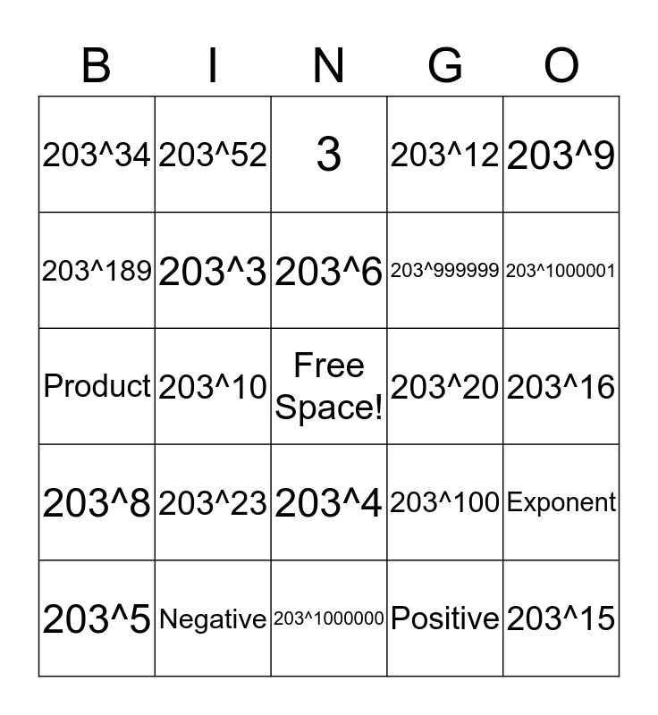 This bingo card has a free space and 39 words: 1, 203, 203^2, 203^3, 203^5, 203^4, 203^6, 203^7, 203^9, 203^8, 203^10, 203^12, 203^15, 203^16, 203^20, 203^23, 203^25, 203^34, 203^203, 203^100, 203^189, 203^1000000, 203^999999, 203^1000001, 203^587, 203^411, 203^29, 203^28, 203^55, 203^52, 2, 0, 3, Negative, Positive, Base, Exponent, Product and Parentheses.
