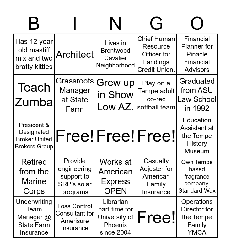 This bingo card has a free space and 24 words: Provide engineering support to SRP’s solar programs, Loss Control Consultant for Amerisure Insurance, Grew up in Show Low AZ., Underwriting Team Manager @ State Farm Insurance, Financial Planner for Pinacle Financial Advisors, Has 12 year old mastiff mix and two bratty kitties, Teach Zumba, Architect, Free!, Works at American Express OPEN, Play on a Tempe adult co-rec softball team, President & Designated Broker United Brokers Group, Casualty Adjuster for American Family Insurance, Own Tempe based fragrance company, Standard Wax, Grassroots Manager at State Farm, Free!, Education Assistant at the Tempe History Museum, Lives in Brentwood Cavalier Neighborhood, Graduated from ASU Law School in 1992, Free!, Operations Director for the Tempe Family YMCA, Retired from the Marine Corps, Chief Human Resource Officer for Landings Credit Union. and Librarian part-time for University of Phoenix since 2004.