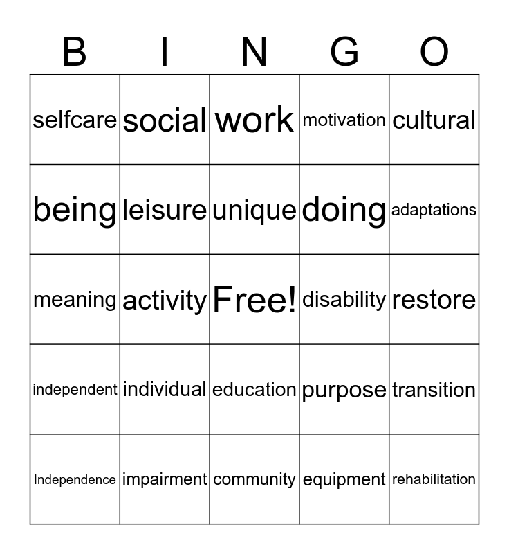 This bingo card has a free space and 29 words: Independence, occupation, activity, daily living, selfcare, work, leisure, individual, disability, impairment, restore, rehabilitation, community, equipment, adaptations, function, education, independent, cultural, meaning, purpose, balance, doing, being, motivation, social, transition, unique and productivity.