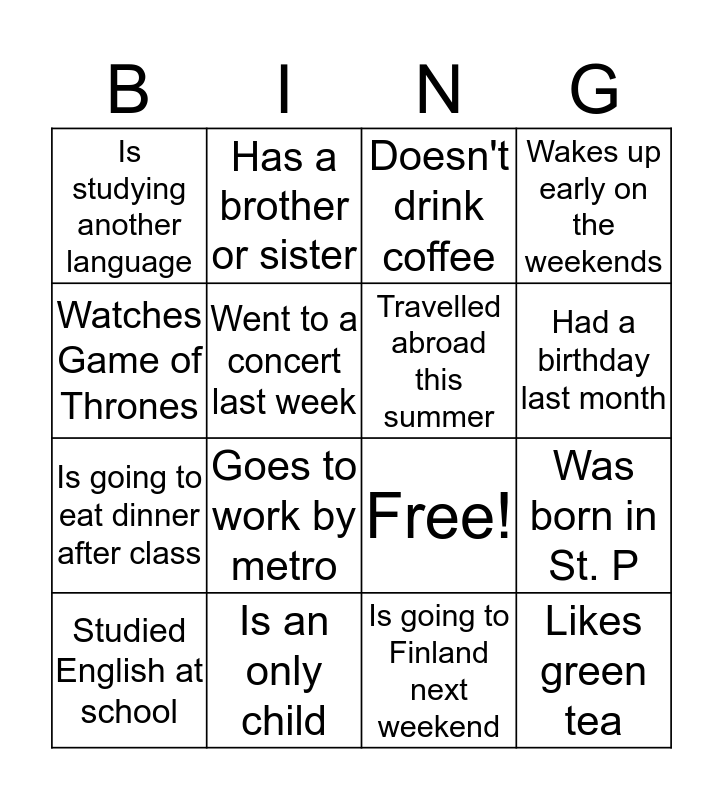 This bingo card has 16 words: Is an only child, Was born in St. P, Doesn't drink coffee, Is studying another language, Is going to eat dinner after class, Has a brother or sister, Free!, Is going to Finland next weekend, Watches Game of Thrones, Went to a concert last week, Studied English at school, Wakes up early on the weekends, Goes to work by metro, Had a birthday last month, Travelled abroad this summer and Likes green tea.