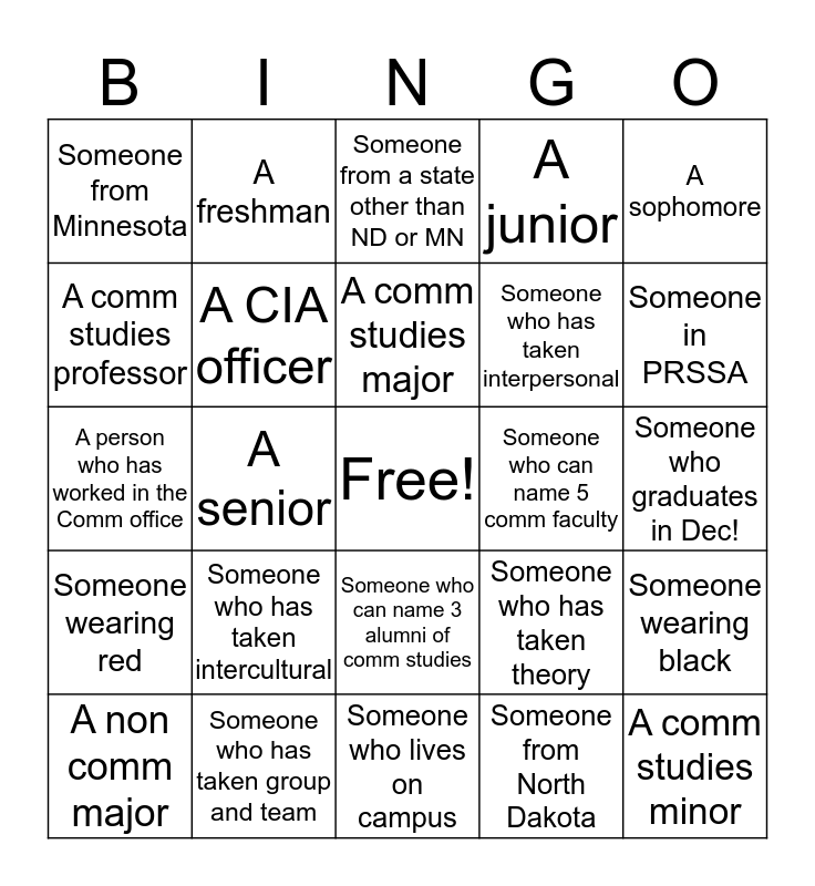 This bingo card has a free space and 24 words: A non comm major, Someone who has taken intercultural, A comm studies major, Someone from North Dakota, A sophomore, Someone from Minnesota, A freshman, Someone from a state other than ND or MN, Someone who can name 5 comm faculty, Someone who graduates in Dec!, A person who has worked in the Comm office, A CIA officer, Someone who has taken theory, Someone wearing black, A comm studies professor, Someone who has taken group and team, Someone who lives on campus, A junior, Someone in PRSSA, Someone wearing red, A senior, Someone who can name 3 alumni of comm studies, Someone who has taken interpersonal and A comm studies minor.