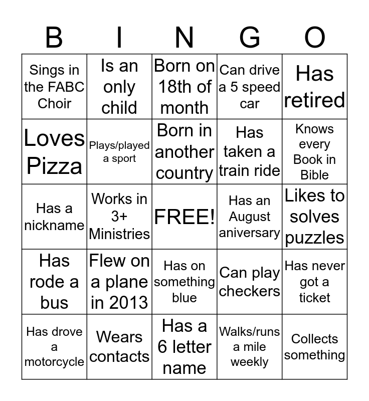This bingo card has a free space and 25 words: Flew on a plane in 2013, Has a 6 letter name, Born in another country, Has drove a motorcycle, Has retired, Sings in the FABC Choir, Loves Pizza, Is an only child, Has an August aniversary, Has on something blue, Has taken a train ride, Has a nickname, Can play checkers, Has never got a ticket, Plays/played a sport, Member of a Sorority/Frat, Likes to solves puzzles, Born on 18th of month, Knows every Book in Bible, Works in 3+ Ministries, Collects something, Wears contacts, Has rode a bus, Can drive a 5 speed car and Walks/runs a mile weekly.