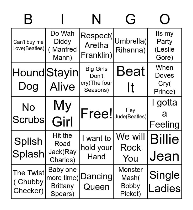 This bingo card has a free space and 24 words: The Twist ( Chubby Checker), Hit the Road Jack(Ray Charles), Big Girls Don't cry(The four Seasons), Monster Mash( Bobby Picket), Its my Party (Leslie Gore), Can't buy me Love(Beatles), Do Wah Diddy ( Manfred Mann), Respect( Aretha Franklin), Hey Jude(Beatles), I gotta a Feeling, No Scrubs, Stayin Alive, We will Rock You, Billie Jean, Hound Dog, Baby one more time( Brittany Spears), Dancing Queen, Umbrella( Rihanna), When Doves Cry( Prince), Splish Splash, My Girl, I want to hold your Hand, Beat It and Single Ladies.