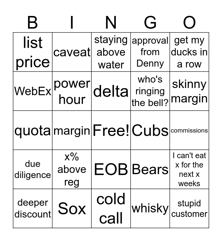 This bingo card has a free space and 24 words: x% above reg, Sox, delta, deeper discount, get my ducks in a row, list price, WebEx, caveat, Cubs, EOB, who's ringing the bell?, quota, Bears, I can't eat x for the next x weeks, power hour, whisky, commissions, staying above water, skinny margin, margin, stupid customer, due diligence, approval from Denny and cold call.