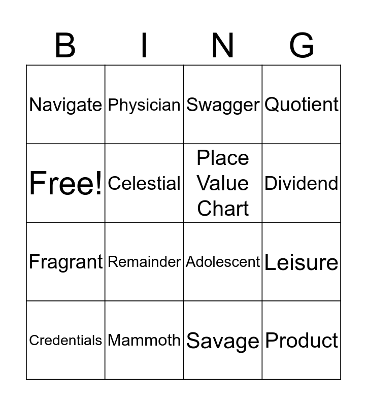 This bingo card has 16 words: Mammoth, Leisure, Swagger, Navigate, Fragrant, Physician, Adolescent, Savage, Free!, Celestial, Credentials, Quotient, Remainder, Dividend, Place Value Chart and Product.