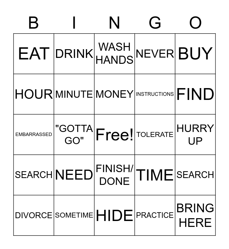 This bingo card has a free space and 24 words: DIVORCE, NEED, MONEY, PRACTICE, BUY, EAT, DRINK, WASH HANDS, TOLERATE, HURRY UP, EMBARRASSED, MINUTE, TIME, SEARCH, HOUR, SOMETIME, HIDE, NEVER, FIND, SEARCH, "GOTTA GO", FINISH/ DONE, INSTRUCTIONS and BRING HERE.