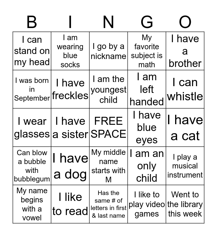 This bingo card has a free space and 24 words: I have a dog, I like to read, I am the youngest child, My name begins with a vowel, I have a brother, I can stand on my head, I was born in September, I am wearing blue socks, I have blue eyes, My middle name starts with M, I am left handed, I wear glasses, I am an only child, I play a musical instrument, I have freckles, I like to play video games, I have a cat, I go by a nickname, I can whistle, I have a sister, Went to the library this week, Can blow a bubble with bubblegum, My favorite subject is math and Has the same # of letters in first & last name.