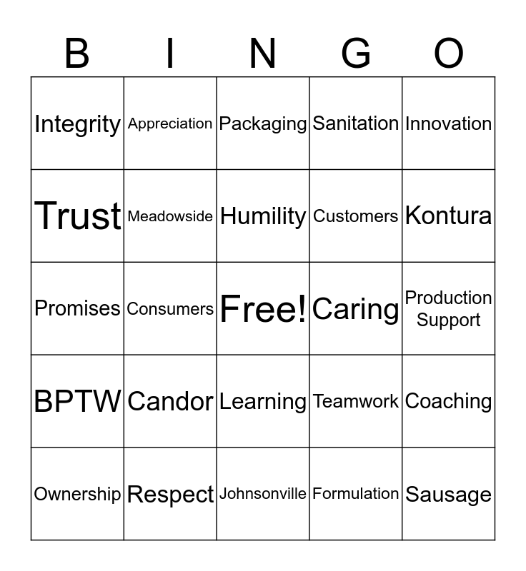 This bingo card has a free space and 24 words: Candor, Respect, Humility, Ownership, Innovation, Integrity, Trust, Appreciation, Caring, Learning, Customers, Promises, Teamwork, Coaching, Meadowside, Formulation, Production Support, Packaging, Kontura, Consumers, Sausage, BPTW, Sanitation and Johnsonville.
