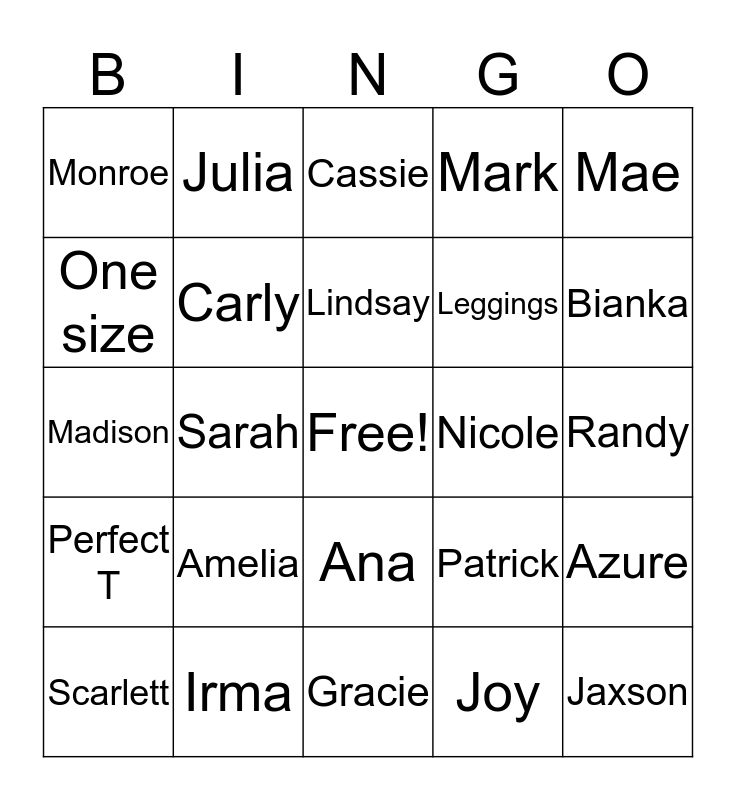 This bingo card has a free space and 24 words: Amelia, Irma, Lindsay, Scarlett, Mae, Monroe, One size, Julia, Nicole, Ana, Leggings, Madison, Patrick, Azure, Carly, Joy, Randy, Cassie, Bianka, Sarah, Jaxson, Perfect T, Mark and Gracie.