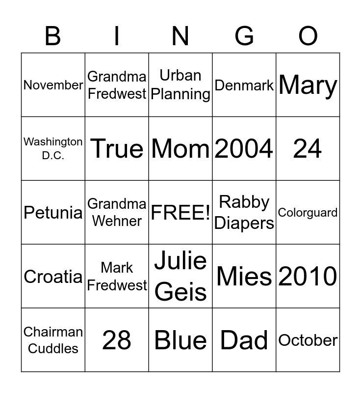 This bingo card has a free space and 24 words: Mark Fredwest, 28, Mom, Chairman Cuddles, Mary, November, Washington D.C., Grandma Fredwest, Rabby Diapers, Julie Geis, 2004, Petunia, Mies, 2010, True, Dad, Colorguard, Urban Planning, 24, Grandma Wehner, October, Croatia, Denmark and Blue.