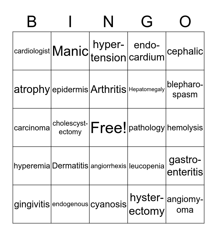 This bingo card has a free space and 24 words: Dermatitis, endogenous, Arthritis, gingivitis, cephalic, cardiologist, atrophy, Manic, pathology, angiorrhexis, Hepatomegaly, carcinoma, leucopenia, gastro- enteritis, epidermis, hyster- ectomy, hemolysis, hyper- tension, blepharo-spasm, cholescyst- ectomy, angiomy- oma, hyperemia, endo- cardium and cyanosis.