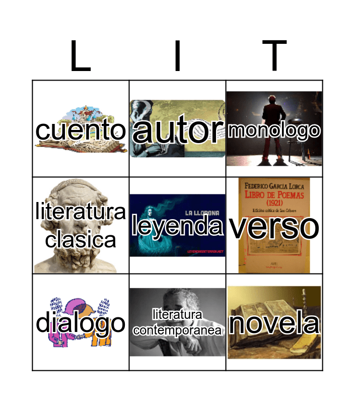 This bingo card has 20 images and 20 words: narrador, personajes, monologo, fabula, mito, leyenda, epopeya, cuento, novela, autor, arte, literatura, verso, literatura moderna, dialogo, prosa, literatura contemporanea, literatura clasica, literatura renacimiento and Literatura medieval.