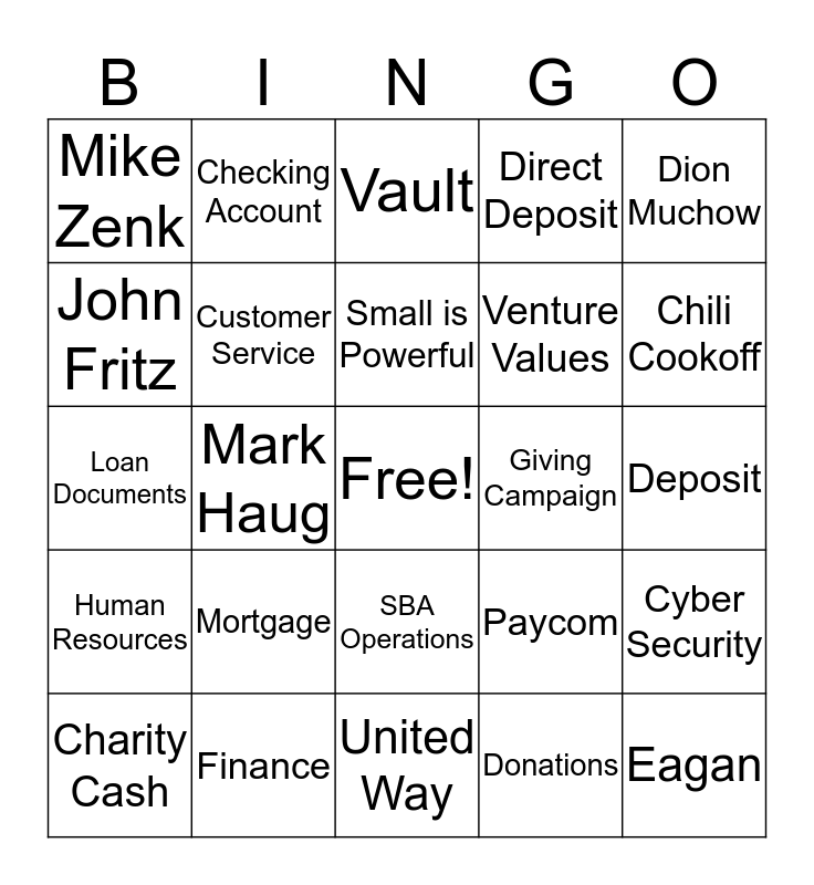 This bingo card has a free space and 68 words: Golden Valley, Eagan, Bloomington, Roseville, Operations, Savings Account, Checking Account, Cash Management, Small is Powerful, Online Banking, SBA Operations, Post-Closing, Deposit, Dion Muchow, Nate Urfer, John Fritz, Mark Haug, Mike Zenk, Gwen Stanley, Mortgage, Venture Values, Paycom, Human Resources, Local Businesses, Cash Flow, IT, Wi-Fi, Twin Cities, Cyber Security, Business Email Compromise, Vault, Marketing, Customer Seminars, Fitness Reimbursement, Direct Deposit, Financial Statement, Compliance, Charity Cash, Chili Cookoff, Loan Documents, Customer Appreciation, Fraud, Customer Service, Cash, Credit, The Golden Stapler, Loans, Office Olympics, Giving Campaign, Finance, Expense Reimbursement, Best Places to Work, Intranet, United Way, Community Shares, Community Enrichment, Donations, Volunteer, Employee Wellness, Strategic Planning, Deliver +1, Community Reinvestment Act, CoachSpot, Minnesota Banker’s Association, Banker’s Edge, KnowBe4, Giving is Powerful and HSA Dollars.