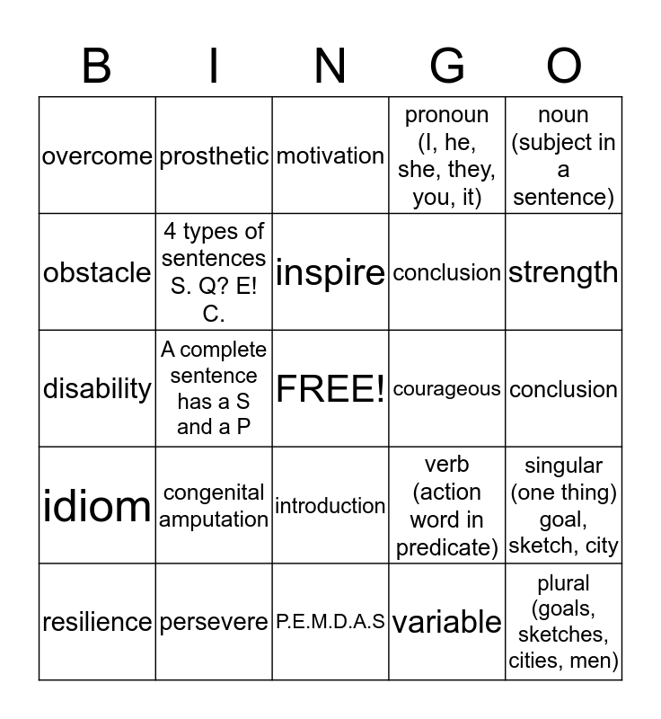 This bingo card has a free space and 24 words: congenital amputation, persevere, inspire, resilience, noun (subject in a sentence), overcome, obstacle, prosthetic, courageous, introduction, conclusion, disability, verb (action word in predicate), singular (one thing) goal, sketch, city, 4 types of sentences S. Q? E! C., variable, conclusion, motivation, strength, A complete sentence has a S and a P, plural (goals, sketches, cities, men), idiom, pronoun (I, he, she, they, you, it) and P.E.M.D.A.S.