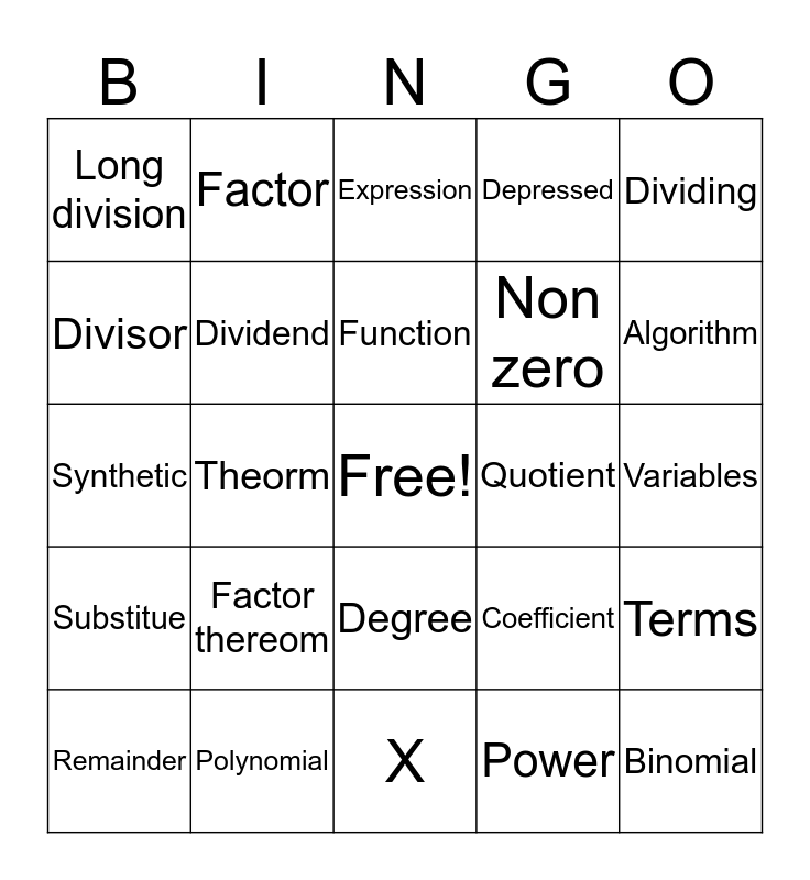 This bingo card has a free space and 24 words: Factor thereom, Polynomial, Function, Remainder, Dividing, Long division, Divisor, Factor, Quotient, Degree, Non zero, Synthetic, Coefficient, Terms, Dividend, Power, Variables, Expression, Algorithm, Theorm, Binomial, Substitue, Depressed and X.