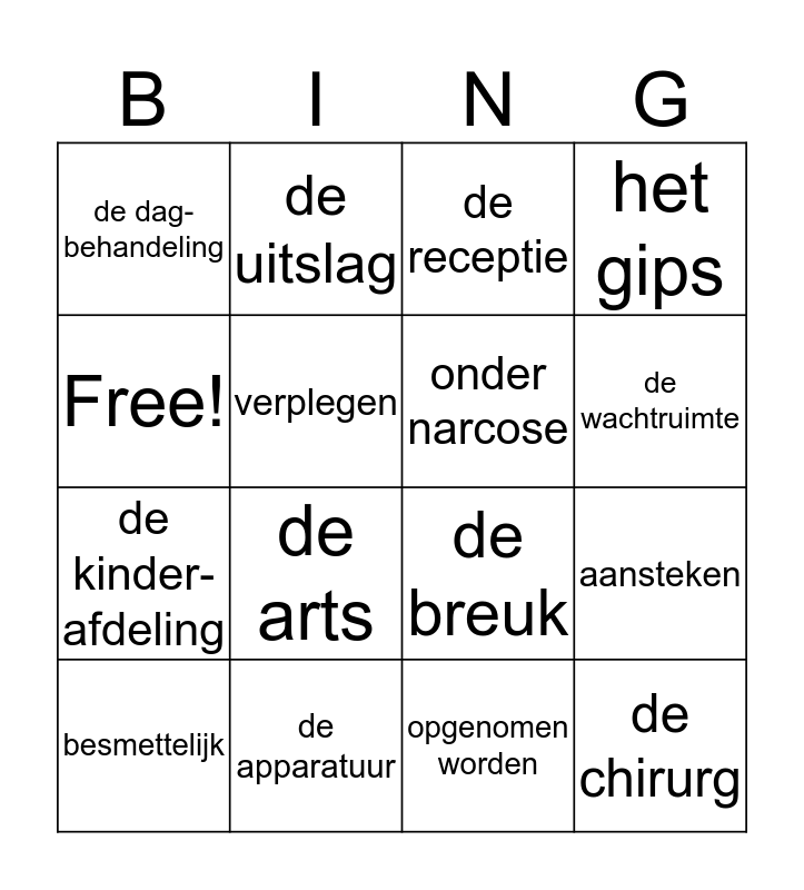 This bingo card has 16 words: de apparatuur, aansteken, de receptie, de dag-behandeling, de kinder-afdeling, de uitslag, de breuk, opgenomen worden, Free!, verplegen, besmettelijk, het gips, de arts, de wachtruimte, onder narcose and de chirurg.