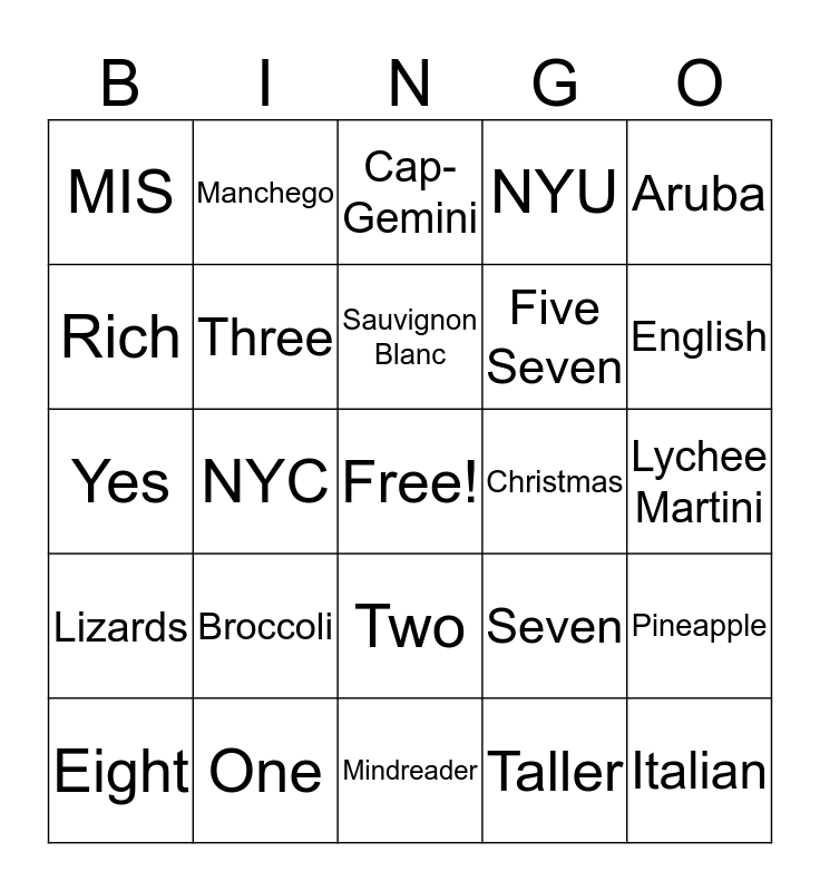 This bingo card has a free space and 36 words: Mint Chocolate Chip, Ten, 1999, Three, Seven, Lizards, Sauvignon Blanc, Thailand, Aruba, Eleven, NYC, NYU, Pink, Christmas, English, MIS, Fish, Broccoli, Italian, Cap-Gemini, Lychee Martini, Pineapple, One, Eight, Mindreader, Manchego, Yes, Right, Five Seven, Rich, Slept, Flown, Taller, Two, Two and Rockland.