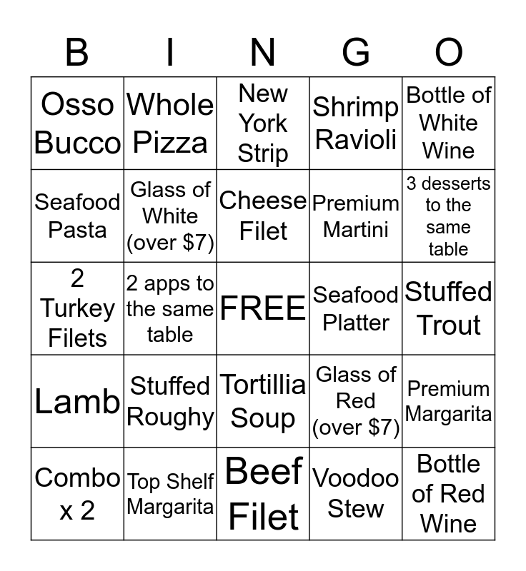 This bingo card has a free space and 24 words: Stuffed Roughy, Top Shelf Margarita, Cheese Filet, Combo x 2, Bottle of White Wine, Osso Bucco, Seafood Pasta, Whole Pizza, Seafood Platter, Tortillia Soup, Premium Martini, 2 Turkey Filets, Glass of Red (over $7), Premium Margarita, Glass of White (over $7), Voodoo Stew, Stuffed Trout, New York Strip, 3 desserts to the same table, 2 apps to the same table, Bottle of Red Wine, Lamb, Shrimp Ravioli and Beef Filet.