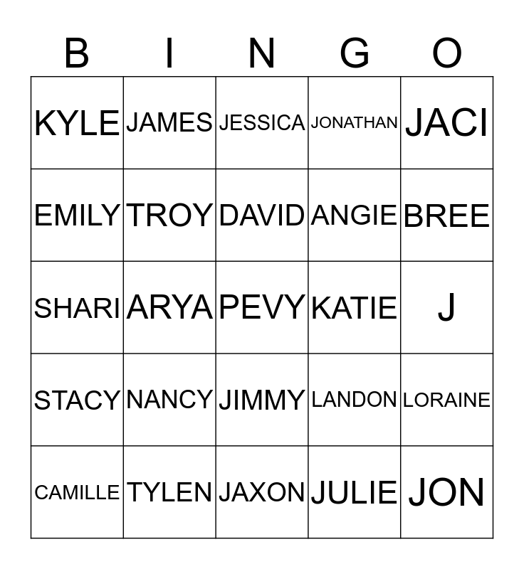 This bingo card has a free space and 24 words: NANCY, TYLEN, DAVID, CAMILLE, JACI, KYLE, EMILY, JAMES, KATIE, JIMMY, ANGIE, SHARI, LANDON, LORAINE, TROY, JULIE, J, JESSICA, BREE, ARYA, JON, STACY, JONATHAN and JAXON.