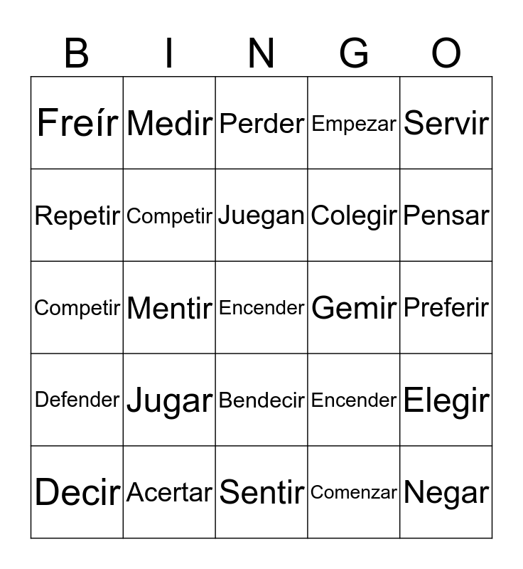 This bingo card has 25 words: Jugar, Sentir, Juegan, Decir, Servir, Freír, Repetir, Medir, Gemir, Bendecir, Colegir, Competir, Encender, Elegir, Competir, Negar, Preferir, Perder, Pensar, Mentir, Encender, Acertar, Defender, Empezar and Comenzar.