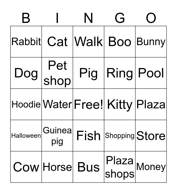 This bingo card has a free space and 24 words: Guinea pig, Horse, Pig, Cow, Bunny, Rabbit, Dog, Cat, Kitty, Fish, Ring, Hoodie, Shopping, Store, Pet shop, Plaza shops, Plaza, Walk, Pool, Water, Money, Halloween, Boo and Bus.
