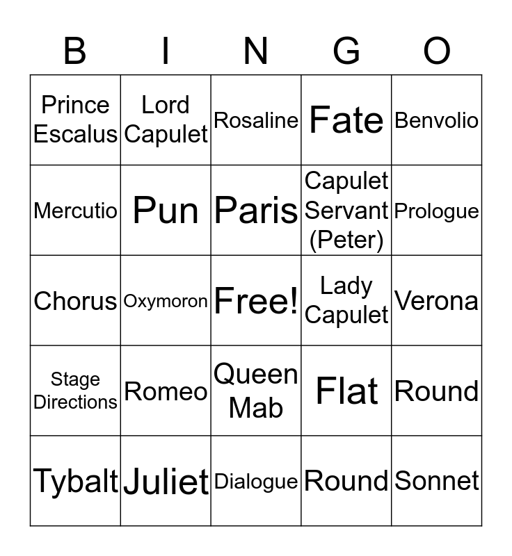 This bingo card has a free space and 24 words: Romeo, Juliet, Paris, Tybalt, Benvolio, Prince Escalus, Mercutio, Lord Capulet, Lady Capulet, Queen Mab, Capulet Servant (Peter), Chorus, Flat, Round, Pun, Round, Verona, Rosaline, Prologue, Oxymoron, Sonnet, Stage Directions, Fate and Dialogue.