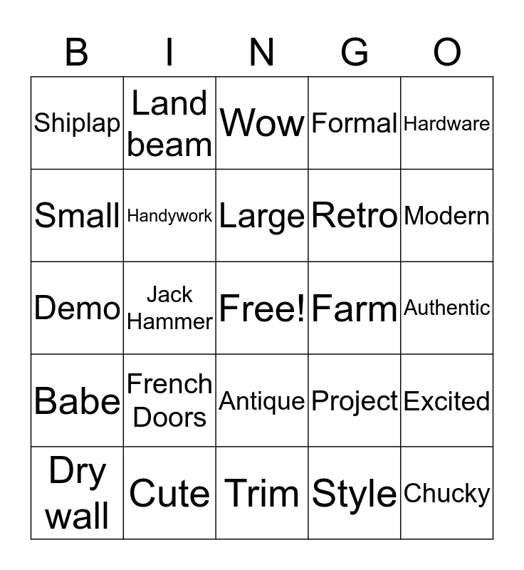 This bingo card has a free space and 24 words: French Doors, Cute, Large, Dry wall, Hardware, Shiplap, Small, Land beam, Farm, Antique, Retro, Demo, Project, Excited, Handywork, Style, Authentic, Wow, Modern, Jack Hammer, Chucky, Babe, Formal and Trim.